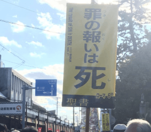 お寺が絶賛大混雑していて、中へ入るために列に並んでいると、お寺の目の前でこんなプラカードを持っている外国人と日本人がいた。