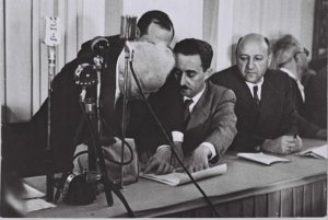 1948年5月14日(西洋暦)、イギリス統治の最終日にユダヤ人指導者ベン=グリオンが読み上げた独立宣言を聞いて彼らは涙を流す。