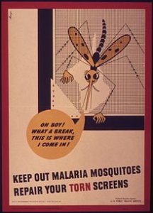 「マラリアの蚊を入れぬよう、破れた網戸を修理しなさい」と呼びかけるアメリカのポスター(1940年代)