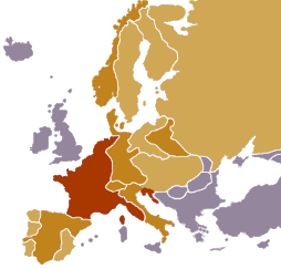 最も色が濃い部分がフランス帝国で、その次に濃いのが衛星国、そして最も薄いのが同盟国。
