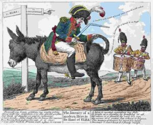1814年、エルバ島に追放されるナポレオンを描いた風刺画。