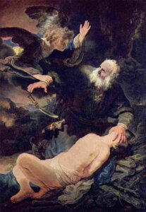 アブラハムは息子イサクを縛り、祭壇にのせてナイフを突き刺そうとしたその瞬間、神の使いである天使が現れて、手を止めさせた。そして、息子の代わりに近くにいた羊を犠牲にしなさいと言った。(イサクの燔祭)