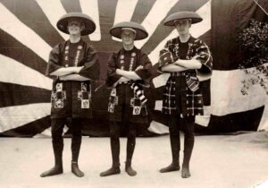 1922年に来日し、人力車夫のコスプレをする英国王エドワード8世(中央)とマウントバッテン。