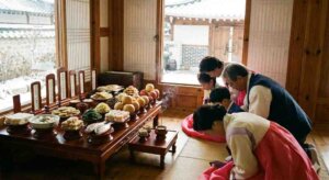 先祖の霊にさまざまな食べ物を供えて、家族が両手両膝を床につけて頭を深々と下げて最高の敬意や感謝をあらわす。このお辞儀を「クンジョル」という。