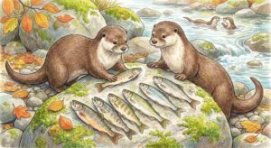 カワウソは変わった生き物で、とった魚を食べる前に並べる習性がある。