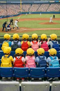 東京ドームで行われていた試合で、黄色い帽子をかぶった幼稚園児たちがスタジアムで並んで座って、観戦したり応援したりしていた。