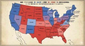 アメリカの政党には民主党と共和党があって、「二大政党制の典型的な国」といわれる。ざっくり言うと、北部には民主党の支持者(青色)が、南部には共産党の支持者(赤色)が多い。