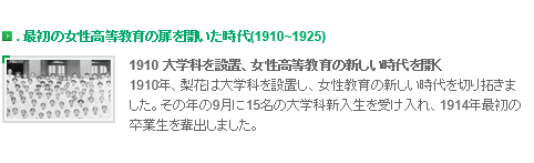 大学のホームページ(学校の歴史)には、「1910 大学科を設置、女性高等教育の新しい時代を開く」と書いてある。