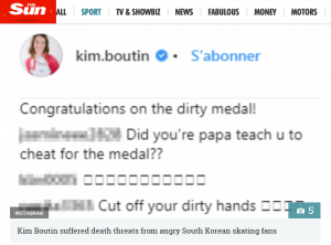 Following her win, Boutin’s social media accounts were bombarded by apparent angry South Korean fans, some threatening the speedskater with her life.