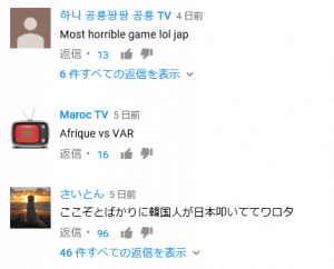 日本戦に限らず、いろいろなユーチューブ動画で、ネット上の日韓戦が行われている。