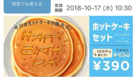 きょうのマクドナルドのクーポンに、「10月17日はホットケーキの誕生日!」と書いてある。