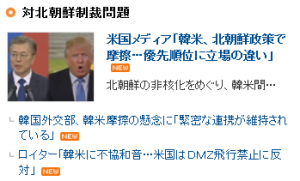 対北朝鮮について南北融和・制裁緩和に向けてひた走る文大統領に、アメリカがイライラしている。