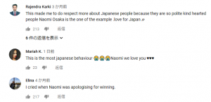 大坂なおみ選手は礼儀正しい日本人の一人で、彼女によって、この人は日本人をもっと尊敬するという。